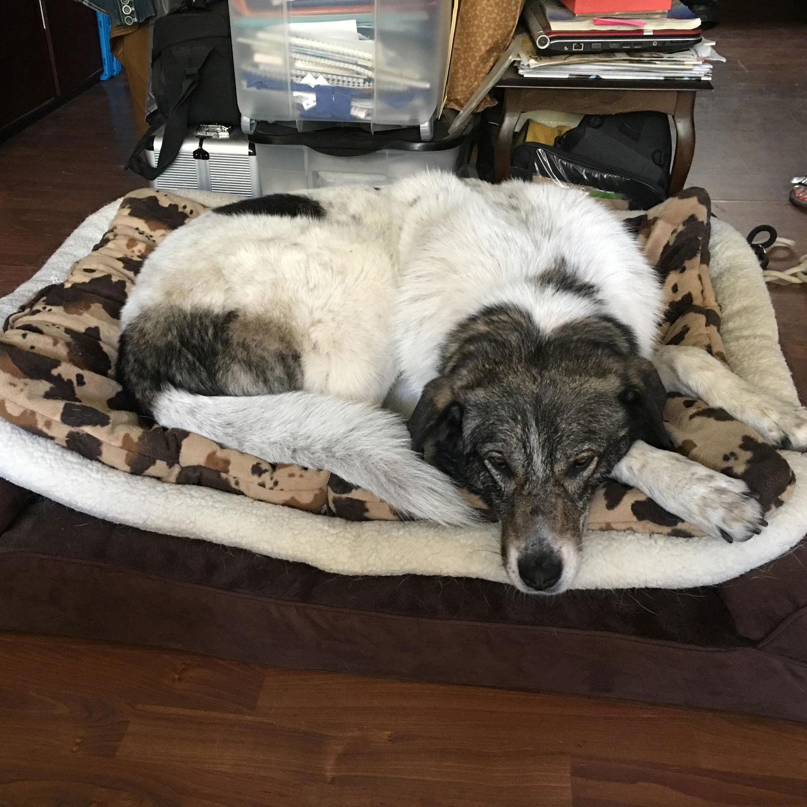 Ze slaapt in de huiskamer en in de slaap kamer, bij mij heeft zij een honden mand maar ze mag af en toe bij mij op bed.