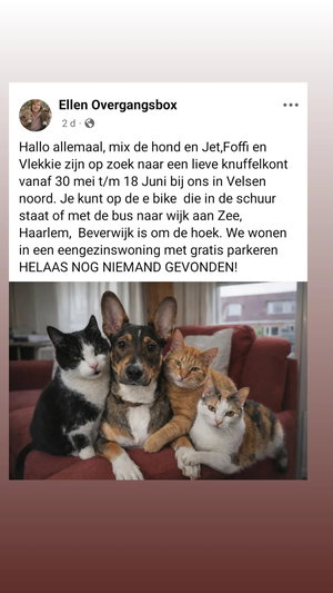 Wij zijn heel blij met een liefdevolle vrolijke dieren vriend of vriendin. Mix is een waakse maar luie hond die graag met ballen speelt in het park om de hoek. Hij kan max 5 uur alleen zijn. Foffi is een oude poes uit Spanje en Vlekkie is merendeel buiten. Jet is onze 3 poot en moet 2 x per dag een pilletje wat makkelijk gaat. Er is geen kattenbak, wel een kattenluik. We wonen in een eengezinswoning met tuin en E bike en gratis parkeren en OV einde van de straat. Je kunt naar Haarlem of Wijk aan Zee, Beverwijk is 7 min lopen. Hopelijk tot gauw.