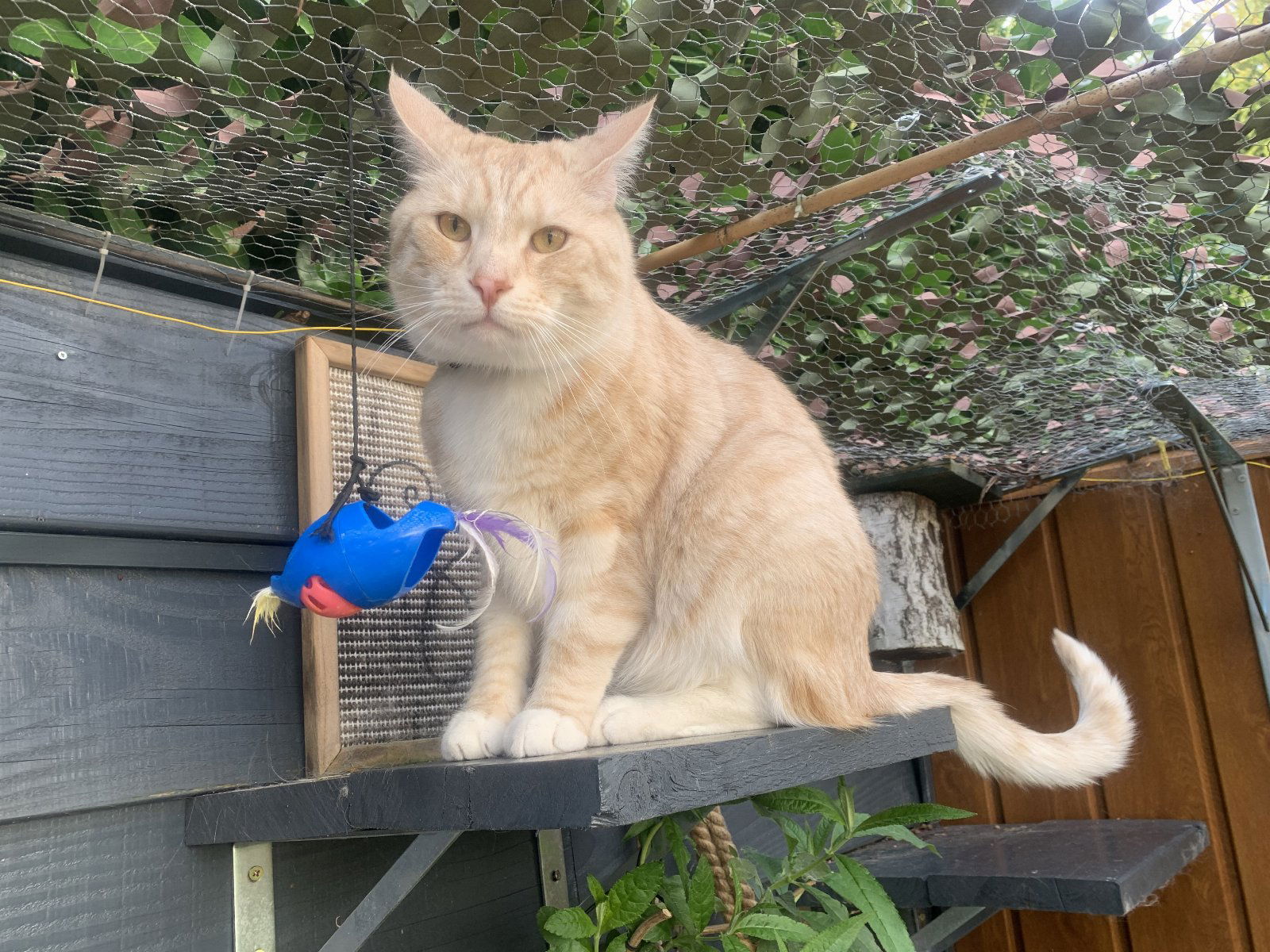 Hero is een grote kat, weegt 7.5 kilo. Hero is een echte koning en ligt graag op schoot. Hero mag alleen in mijn achtertuin als ik er ook ben. Hij luistert goed en is makkelijk naar binnen te krijgen als ik weg wil. Buiten in de tuin heeft hij een tuigje om. Ik heb een omheinde tuin met veel planten, een vijver, hoge plankjes voor de katten en veel zithoekjes in de zon.